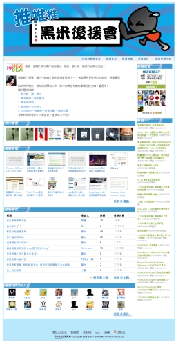 距上次寫黑米雖只在短短五個月前,卻有如過了半世紀。黑米發展到今天雖尚未進入創市際ARO前一百名,但已累積了一群黏度超高的忠誠粉絲,也發展出自有的「鄉民文化」。回首黑米的成長一路點點滴滴,有過難以決定的首頁設計調整(如恢復「最新書籤」區塊、該不該加入「本日最多分享」等等),也得到過網友意外的熱心支持幫助(如網友CK為黑米寫了「誰收藏本文」與「誰在背後講我」兩支Script並免費捐贈予黑米!如黑米踢衣服預購活動在9小時內將100件銷售一空,為了加序號還加印了50件!)每天在黑米站上,更繼續出現一篇又一篇叫人噴飯的討論與一場又一場的網聚活動,最可貴的是,葛力與閃恩仍繼續絞盡腦汁開發更新更特殊的應用,希望能突破黑米目前的會員範圍,讓那些平時不太接觸新網站的980萬名沉默網友,除了利用網路去寫email、看新聞、玩MSN以外,還多了一個「黑米」可以玩。