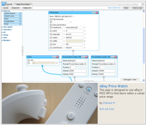 […] Yahoo! Pipes Mr.6曾寫過一篇介紹,我就不再贅言。Openkapow也是類似的東西,朋友Alan曾玩過,對其讚不絕口。Openkapow是standalone軟體,需要下載安裝,功能十分強大。Yahoo! Pipes則是Web-based Ajax介面,不是Flash / Flex的卻做的漂亮無比。對我這種不喜歡安裝軟體的人來說,當然是先玩玩Yahoo! Pipes。 […]