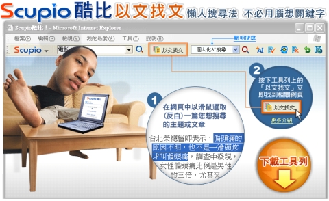 大家對酷比(Scupio)的印象大約都是「它和Google做同樣東西──搜尋引擎」。知道的比較深一點的,就會說他們是做「以文找文」,是「全球唯一沒有字數限制的中文搜尋網站」,以此來區隔與Google的差異,而每當與這樣的人聊到酷比,他們往往還要加一句話:「唉,技術強的,不見得可以賺很多錢。」
