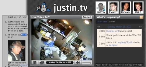 這個Justin.tv網站自八天前開站以來,在一周內被TechCrunch寫了兩次,當TechCrunch一周前第一次寫到Justin.TV,僅淡淡表示五年前早有DotComGuy、JenniCam,一直到最近都還有OurPrisoner.com試著做真人live秀求一爆紅,但Justin可說算是第一個可以把攝影機帶著四處趴趴走的,而且他的行程排得很有趣,包括跑去見ShoutFit、PairWise、LicketyShip等其他網路公司暢聊。TechCrunch的報導,讓Justin名氣從第一天開站就急升到頂點,Justin為了效果,還不忘留一支手機號號碼在網路上,增加與觀眾的互動,不料,樹大招風,四天後代誌大條了,某位無聊網友盜用這支手機caller ID報警,說家裡有兇殺案,舊金山警方查了手機號碼發源地,馬上真槍實彈的把Justin所在的小公寓團團包圍,攻堅進去,什麼凶殺案也沒,只有一群打電腦的年輕人和滿地吃剩的比薩與可樂罐。這段過程當然也被當時在屋內的Justin完全拍下,成為觀眾意外撿到的大驚喜。