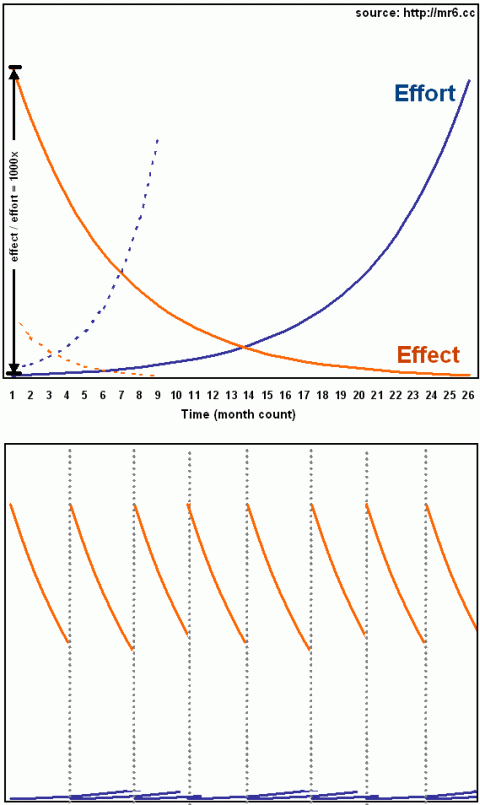 如果以圖示的話,如下圖,可以把這種「1000倍的善搞效應」看得明顯一點。正統的善搞以實線表示,橘色的線(效果)與藍色的線(成本)一開始差距是1000倍,爾後一個月、二個月後,效果急速下墜,成本急速升高。這時候連忙學起來的「競爭者」以虛線表示,可看到效果只有原創者的三分之一,成本卻要原創者的二倍。也就是說,雖然想學善搞的競爭者往往無法成功,但原創者本身也撐不了多久。