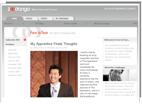 上周有篇文章寫到一個叫Zoodango.com的美國社群網站的創辦人為韓裔的James Sun。他參加了今年唐納川普(Donald Trump)的「誰是接班人」(The Apprentice)的秀,並一路打進前四名。後來,James不幸在這幾天被刷下來了,比賽的大部份過程都在十幾台錄影機的記錄下,播送到全美國的客廳,所有觀眾都目睹川普對著韓裔的James說:「I didn’t like some of the dialogue.」(我不認同你之前所提到的一些話語)然後還補上一句,「you know what I mean.(你應該知道我在講什麼)。接著,川普照例把嘴嘟成O字型,說:「James, You are Fired!」