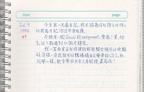 一直到了加拿大,某天下午心血來潮,想又開始寫日記,晚上已經把線畫好,開始寫下:「今天第一天寫日記,我不認為可以持之以恆,以前寫日記,往往半途而廢。」我還提到當時上加拿大高中的社會課作業好多寫不完,還希望正在修理的錄音機可以快點好,可以開始在房間裡聽CD……當時15歲的我沒想到,這一寫下去,竟然是16個年頭。寫日記的第一天高掛著「VT」,因為這一天比畢業典禮、錄取研究所、找到第一份工作、結婚生小孩都特別。