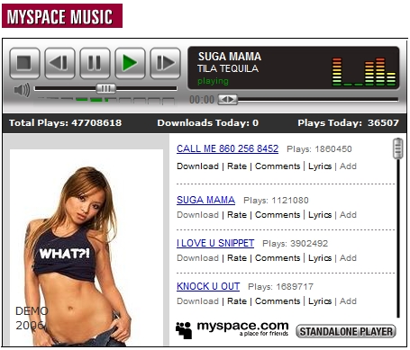 MySpace的音樂不斷的創造奇蹟。比如,最近最常提的,就是越南出生、新加坡籍的Tila Tequila,在MySpace上超紅,大家爭相和她成為朋友,讓她擁有超過100萬名朋友名單。準備出唱片的她,想說自己好友已經這麼多人,不打算經過正式的出片管道,直接在iTunes上面以每首一美元讓網友去下載。這件事在三個月前曾獲紐約時報特別報導,不過,主流人士看這件事的重點,都擺在「她的好友名單是不是等於消費者?」「這樣的平民天后會賺錢嗎?」但,我注意的是,這位平民天后並非歌手出身,MySpace卻讓她變了歌手。「音樂」到底是什麼?到底「音樂」這個「非網路事業」,和社群網站這個「網路事業」之間的拉拔關係為何,是音樂成就了MySpace,抑或是MySpace成就了音樂?