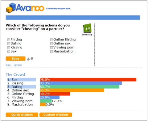 最近一周最有趣的新網站應該是Avanoo.com。我們看到Mashable、Download Squad、VentureBeat皆撰文介紹了此站,不約而同的將Avanoo形容成一個「群眾智慧」(wisdom of the crowd)網站,提供了生活碰到的哲學(與爭議較大)問題的更大範圍的解答(providing larger answers to tackle the philosophical questions of life)。打開此站,會發現上面列出一些「我很熟悉,卻仍然很想知道大家都怎麼想」的議題,譬如:「你認為全球暖化問題會在我們有生之年造成大災難嗎?」</a、「網友的留言應該經過審核,還是永遠馬上出現在留言版?」、「怎樣的情況下才算得上是欺騙了枕邊人?」、「殘忍的狩獵應該合法嗎?」等等,令人很想知道大家怎麼看這些問題。不過,再看此站一眼,會發現它真的有些巧妙之處,比較下來前面那些偉大的Avanoo官方說法反而沒講到此站最棒的重點。