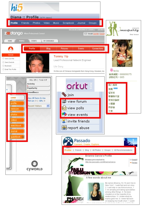 社群網站的標準配備之一就是「個人首頁」,但個人首頁憑一頁肯定無法顯示所有好友名單、所有加入群組、所有相片、所有留言等等資訊,所以,好友名單就會自成一頁,我的群組也自成一頁,全部都通過上面或左邊的一條「menu bar」去瀏覽。看多社群網站的專家通常只要瞄一眼menu bar上顯示的字眼,馬上就可以抓到此社群網站的特色與精髓,譬如Cyworld特開了我的塗鴨簿,Refurber特開了我的意見,Zoodango特開了我的應酬等等。這些東西被稱為一個社群網站的「元素」(elements)。
