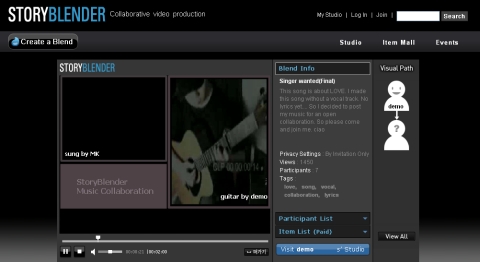 第一個網站叫StoryBlender,這個網站讓網友在網路上「共同製作」新影片。譬如我上載一支我家小狗狗一分鐘灑尿影片,你可以拿另一部也是一分鐘的狗狗卡通片幫我加在後面,還幫我們大家都配上音樂、加入大字、加入音效,全部在線上完成,然後和另一個城市素不相識的網友網友一起玩。StoryBlender的介面非常清楚的表達,它就是要做這麼幾件簡單的事,申請會員後,你可以按左上角的「Create a Blend」直接開始做一部新片,而且一開始根本不必影片,只要填資料,就自動幫你生成一個非動畫、只播放五秒的「cover page」。如果不想自己開始新影片,創意又偏偏滿顆腦子讓你快要顱爆,也可以從已經上傳的影片中,選一部加入一起製作。網站右上角是三個最重要的功能,Studio羅列出目前已做好的影片,Item Mall列出一些可拿來加入你的音樂的元素如音效、音樂、卡通圖案等等,有的還要收費,處處充滿avatar的商業模式。