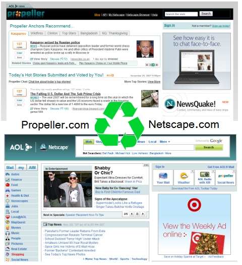 這兩個網站,第一個是「新瓶舊酒」,也就是表皮換成了Propeller,但內裡還是原先的Netscape.com的推文東西。第二個是「舊瓶新酒」,也就是原來的Netscape.com域名中,將換成更激進的新東西。一個網站巧妙的自斷尾巴,巧妙的一拆為二,有可能分頭長出兩隻健康的大海星。怎麼說呢?