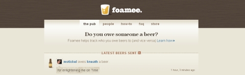 四、「日常小動作」的社群:之前有提過一位印度創業家創FunPiper.com,主打老美每周一在電梯裡都會問的一句話「How was your weekend?」。現在又有另外一個網站叫「FoamMe」,在美國,如果你幫同事解決電腦當機的問題,幫他撿起一顆肩頭上的頭皮屑,提醒他今天是情人節別忘了先訂花,對方除了道謝以外,可能還會加一句:「I owe you a beer」。這就很有趣了,因為現在已經有很多幫人記「誰誰誰欠誰誰誰」的網站,然而網路是個玩樂的地方,不太適合做這種嚴肅的記帳記債的事,但像「I owe you a beer」這類,大家平時說說也不會記下,天生就是做成一個無釐頭網站的料。FoamMe用的是近似Twitter的列表法,每一行寫著「誰誰誰欠誰誰誰一杯啤酒」,你還可以寫一句話補充。
