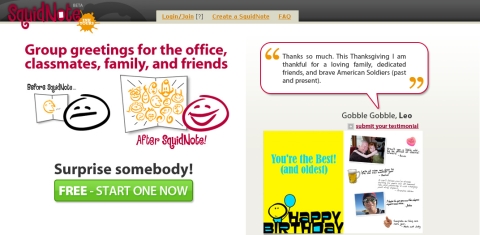 三、加入共同製作,我也想做一個!年節到了,從前的線上賀卡服務曾流行一陣子,我生日收到你的賀卡,你生日我也想挑一張有趣的賀卡寄給你。但這已經過時了。有一個網站叫SquidNote,卻巧妙的推出有病毒式概念的「加強版線上賀卡」,它提供一些現成的「空白線上賀卡」,讓一群同事只要提供他們的email住址,就會收到邀請函,點進去人人都可以在賀卡上塗鴨留言,最後再寄給那位壽星。