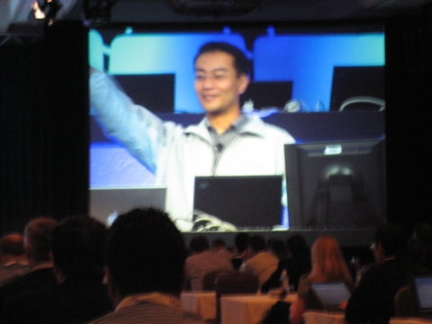 今天美西時間早上九點二十分,輪到AtlasPost地圖日記,上台作了demo。Jerry在台下照相,Andy在台上操作,而整段的靈魂人物是James。James從前演過戲,舞台經驗豐富,DEMO五光十色的舞台,正好就是他最熟悉的地方,一出場就氣勢十足。比起其他的講者上來就只能瞪著黑壓壓的台下,James還可以先轉個大圈,讓大家看清楚AtlasPost的標誌。