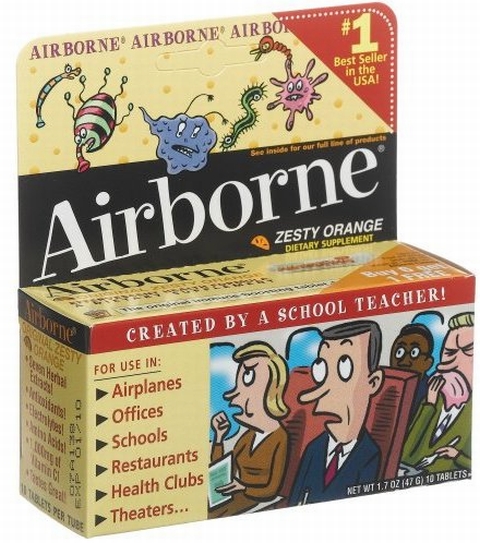 這次在美國的藥局的架上,發現了一個前年沒看過的新牌子。這個牌子的廣告打得頗醒目,叫人很難不發現,它叫做「Airborne」(Amazon亦可買到),盒子上面寫著,平常常去公共場所的民眾請注意!公共場所有很多病菌你們知道嗎?尤其是學校、飛機上,一人感冒,全室都在傳染…「Airborne」號稱是讓人們「專門抵抗公共場所的病菌」,吃了一顆,就可以加強本身抵抗這些公共場所的病毒的抵抗力。