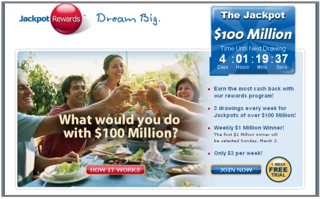 先來看看JackpotRewards.com,和一般樂透玩法一樣,選號碼,他們再抽出六個號碼,看看你中幾個。它一再強調,每周開獎三次(次數真多!),只要你的號碼對,每一次都有得到1億美元的「機會」;然後「只要」總金額數超過100萬美元,一定會將這獎金頒給某一位會員,無論他的號碼是什麼。如果你運氣沒好到一次中六個數字,只中兩個數字?你仍然「有機會」得到100萬元的獎金。說得比唱得好聽,我連點了三頁進去,無論是從它的影片,還是從它的獎項,仍然看不出它是在玩什麼玩意,獎金從哪邊來,抽獎辦法又是如何,只能從它的Shopping,以及它強調「拉愈多朋友進來得獎的機會愈大」來知道它大概是從某種referral program去賺到錢,當然它還會酌收會員費,「一周3美元」,也就是一個月12美元左右。這樣不清不楚的網站,竟可以得到大眾的注意。
