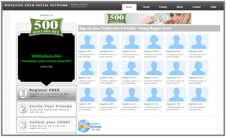 另一個網站是500Dollars.net,你覺得自己很帥很美嗎?只要申請,站方會從其中選入「入圍者」,大家可以透過社群網站將這道訊息散發出去,鼓勵每個人投票。每次投票都要付一美元,最後的得主可以得到500美元,以社群網站的威力,十個入圍者在一周內取得1000個人為他們投票應該不難,假設每周都會辦一次這樣的活動,然後周周都產生出一個500美元得主,站長自己也周周賺500美元了。不過,我自己試著申請500Dollars.net,把我的email都給它了,但它還是不讓我login,大概還在「選人」吧。奇怪的是,此網站的住址等欄位都要使用者用不太符合網路使用規則的方式來填寫,我猜想站主對網站不甚了解,送到海外外包製作此站,此站或許根本尚未完成,站長現在暫時用email,來收取這些申請函。這樣的網站,居然也可以得到大眾的注意。