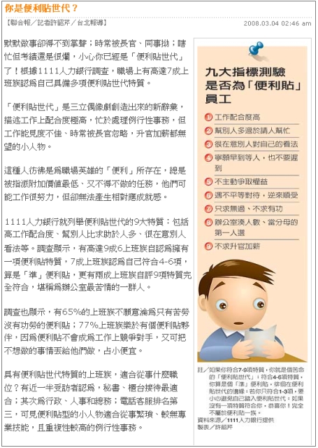 這篇市調很有意思,只是我認為,它所判斷「便利貼族」的人數出了一點差錯。問卷有點tricky。由我來填的話,我會選「工作配合度高」(我以為他在問EQ的問題)、幫別人多過請別人幫忙(我以為他在問能力的問題)、很在意別人對自己的看法(我以為他在問我自我反省方面的問題)、不主動爭取權益(我以為他在問我虛心求教的問題),很輕鬆的就點了四點,於是,我也成了「便利貼族」了?