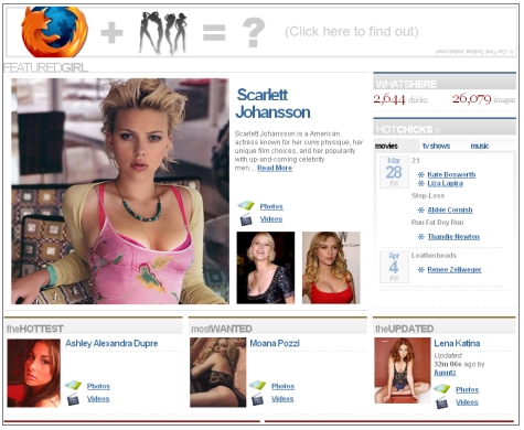 第三個網站,應該也是一個會讓女性主義者抓狂的網站,叫做Chickipedia,中文就翻成「尤物百科」吧。它以維基的偉大精神,集眾人的力量,找來每個知名或半知名的大尤物的所有資料,還有(想當然爾)大量的照片。它在每個女性的資料旁邊擺著一個女體輪廓,依部位寫上三圍,下面還可點選「其它和她差不多身材的尤物」,可跳到下一個。目前資料庫裡已收集了2636隻尤物,一共有2萬6千張各式各樣的騷首弄姿的高畫質照片,很多穿得很少。