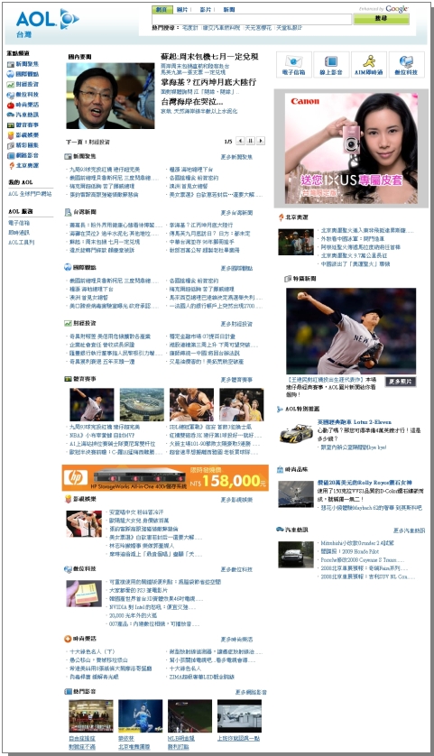 如果AOL這次是玩真的,那麼,這將是美國網站GAMY「四大天王」第一次正式在台灣「全員到齊」。另外三天王,Google於前年抵台,微軟、Yahoo!奇摩年代已相當久遠。嗯,說到Yahoo!奇摩,這個新的AOL.tw的畫面竟和Yahoo!奇摩、以及其他幾個本土入口網站如PChome、Yam天空有幾分相象,已經是入口網站的標準長相了。在這個年代AOL跑來台灣再開一個入口網站?而最近AOL其實正在全世界大鋪站點,一年計畫鋪全球30點,台灣這邊是第十幾個,但台灣這邊有如春秋戰國,兵火之多,最後似打不過西邊一個強力Yahoo!奇摩,AOL有機會嗎?