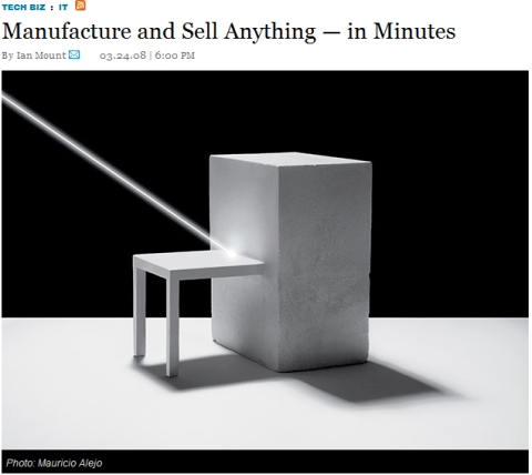 「自營者」的趨勢,其實是更深遠的。上個月Wired雜誌才剛報導一篇「幾分鐘便製造完成的製造商」一文。很吸引人。現代有一些工廠專接來自於「自營者」On Demand的訂單,除了網路界大家都知道的Zazzle與Spreadshirt專幫人印製T恤與杯子等等老掉牙的方法,它還舉了好幾個「不可能的例子」,譬如紐西蘭那邊有一家公司叫Ponoko,專門幫人製造木造的家具,你想做什麼都行,Ponoko接了你的設計書,便叫他們的雷設割木機,自動的滋滋滋滋的割出你設計的樣子,幾分鐘內就可以完成,去做下一份訂單。報導舉例,一位網路設計師閒暇之餘自行設計一個有弧度的小茶几,Ponoko以原價124美元就做給他,他在網路上賣250美元,毛利50%以上,竟讓他成功賣掉了兩個!。你說,兩個有什麼了不起?但,「自營者」很爽了,更爽的是Ponoko。它目前有5000位這樣的「自營者」客戶,每個月都賣兩個,就是125萬美元(近5000萬台幣)的月營收。