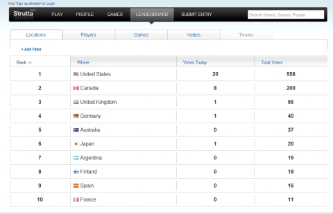「集合」什麼?我們該問的是,為何這些「厲害的人」,在平常有機會和身邊人比較以後,還要把自己貼到你這個網站來?大家平常都有事情要做,讓他們要想「風光」的這個動力實在太小了。我們應該研究的是,為何此人當初會想「練」這個?或者訓練狗狗、小寶寶做這個那個?也沒為什麼,只是覺得這樣很炫,然後他們就想「更上一層樓」,或為自己的程度下一個公定的「指標」(我到了第x級囉!),就可以從中得到成就感。所以Strutta這個網站,是在幫網友和其他同樣厲害的「網友」作「集合」。他們名義上是在競爭,但其實是在與對方「集合」,判別自己到何處,甚至交朋友。「集合」的過程中,「排行榜」(leaderboard)的設計也很重要了。看看Strutta的「排行榜」就知道它的設計,它除了比較所有的參賽者的分數外,也依「國家」來比較!目前站上第一名是美國,第二名是加拿大,第三名是英國,第四名是德國,第五名是澳大利亞,同國的同題目的,他們真的從競爭者關係變「伙伴」了,這樣一個網站的「使用動機」就就豐富起來了。
