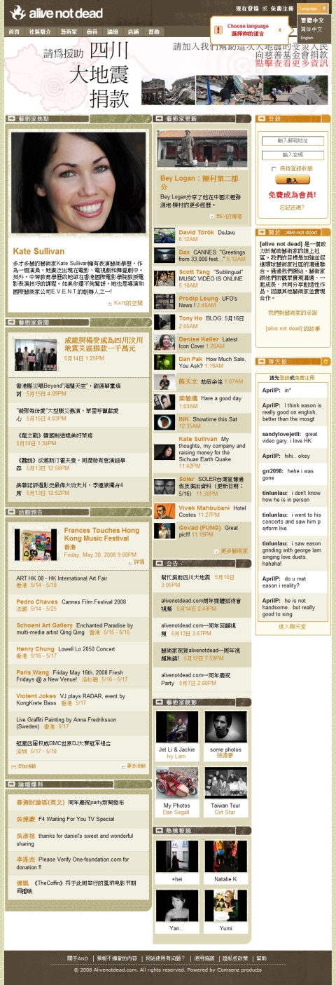 有人說,社群網站的版圖或許已「大勢底定」……唔,除非有「外力」協助。這外力不是外星人。最近有一個專營明星與粉絲的雙語社群網站默默歡度1歲生日,它叫做「Alive Not Dead」,這個網站靠的「外力」,看看它站內主要明星就知道:李連杰、吳彥祖、吳建豪、連凱、陳子聰、胡凱莉……。