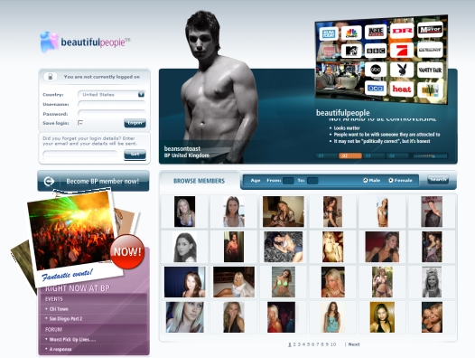 Beautiful People是一個很特別的老牌社群交友網站,基本上,他只讓帥哥、美女、型男、辣妹……外表好看的加入。每個新會員,必須讓一群由站方自動挑選的異性作審核,72小時之後才會回覆Yes or No,據說「錄取率」竟低到只有10%,十個申請者有九個會被拒絕。這個網站早在2002年創立,但畢竟每個國家的美麗的人不是這麼多,還好每個國家都有美麗的人,所以這個站註定要走全球化路線了,目前已進入16個國家,總和會員數已達17萬人。