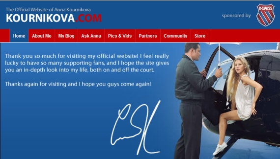 不過,最近,網球女將庫妮可娃(Anna Kournikova)的官方網站「kournikova.com」宣布重新開站,讓許多網路人耳目一新,因為它是少數的在球員身上貼了明顯企業標誌的官方網站──右上角的明顯位置,擺了知名球鞋商「K-SWISS」的商標,仔細看看整個網站的看觀(look and feel),也完全緊跟著K-SWISS的那藍色與紅色的企業識別系統(CIS),一不小心,會以為庫妮可娃是K-SWISS的「分公司」!