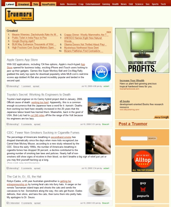 看看Truemors,其實就像這些ValleyWag這種八卦部落格沒兩樣,但Truemors的「競爭優勢」是,它開放讓大家去貼、讓大家去傳: