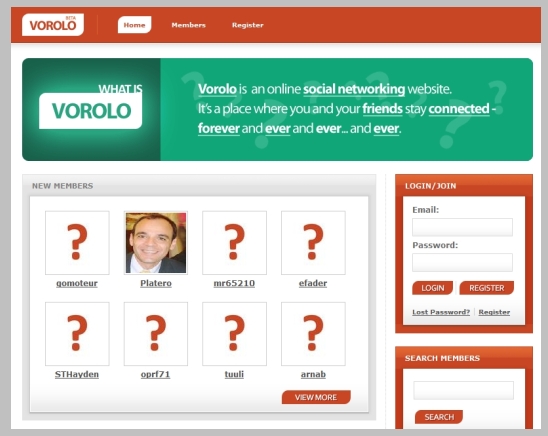 第二個網站是「Vorolo」,它在首頁也開宗明義的宣布,我們是一個「社群網站」,這是一個讓你與你朋友保持聯繫的場所,能讓你的朋與你的朋友們,永永遠遠的保持聯繫,永遠,永遠,永遠的永遠………!