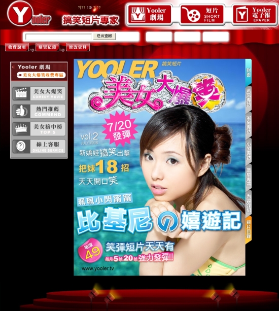 7月5日,台灣三大影音平台之一的Yooler在網站整理之後重新定位成「搞笑短片專家」,推出新產品「美女大爆笑」,固定在每個月的五日、二十日「發彈」,每一彈由12支1~3分鐘以內的搞笑短片組成,目前已經發了兩彈,使用者可免費點進這兩本Flash雜誌,看看這期有哪些新的美女與新的搞笑內容,但想看那12支影片?就得付費,一彈只要台幣49元,看這12支片外加免費收看「美女榜中榜」。若一次購買半年份十二彈則只需付$588,網友透過手機或市內電話作小額付款來完成動作。