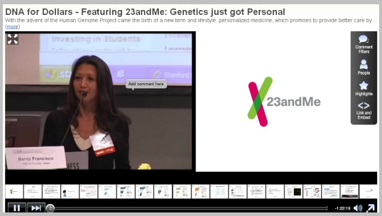 Omnisio所提供的「影片花絮工具」有好幾樣,看看這支影片就知道,其中之一,是讓使用者可在影片上加入類似漫畫的對話框,很像八卦雜誌的「設計對白」那樣,所以假如你錄下某人演講,你可以在他的旁邊加上「唔,我忘詞了。」這種的東西。第二,Omnisio讓使用者開「兩個框框」,左邊放影片,右邊放簡報,下面更有一條超棒的「簡報河」,滑鼠拉過去,就可以看到簡報的內容。今年五月,Omnisio更加上一個「超級殺手級」功能,可以讓你直接把一個SlideShare簡報和一支YouTube影片合在一起並照指定時間播放。之前我寫過一篇「DHH演講與王建民的關係」一文,引用的那場演講,也正是用Omnisio的系統。
