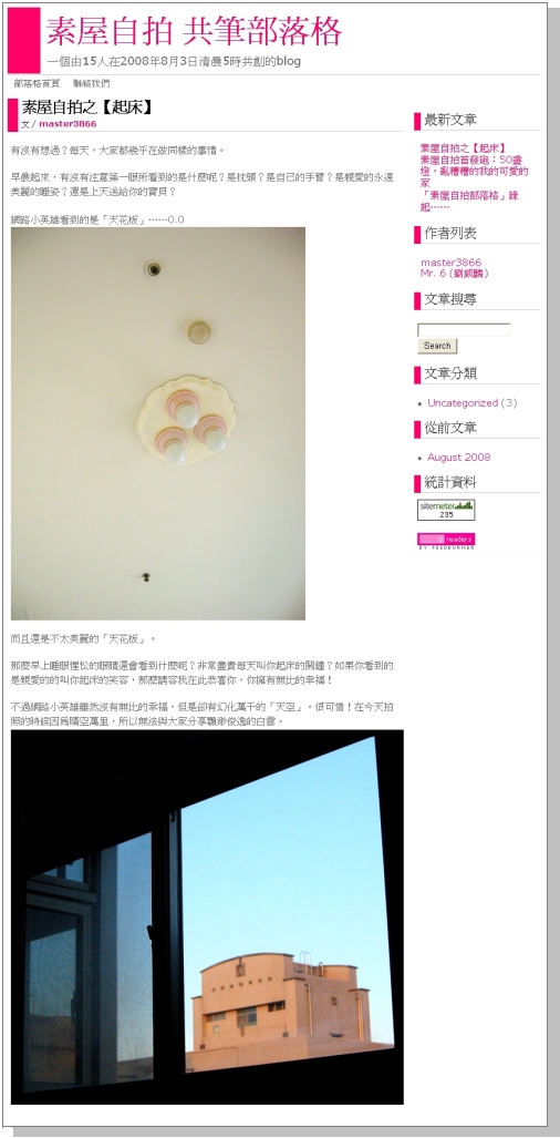 一個部落格的成功需要其他元素,新的部落格要繼續寫下去,最直接的就是要感受到「讀者」的存在,而讀者會每天回來,一定要有一個「話題核心」,於是吸引的就會是同一批的讀者班底,天天回訪,此事若失敗,部落格不可能起來。不過看這14位網路上臨時成軍的網友們,住在不同的城市(台灣、馬來西亞、香港、大陸、美國),從事不同的工作,有興趣的主題也南轅北轍!這樣要怎麼下核心主題?經過兩天腦力激盪,問過無數的人(包括幾個在媒體工作的朋友),我決定:為這個部落格定名為「素屋自拍部落格」。