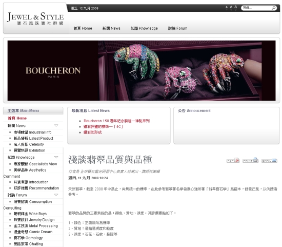 最近有個小型的特殊社群論壇「寶石風珠寶社群網」(Jewel and Style)於上個月重新改站推出,寶石風是在去年1月發想,2月時創業家便成立工作室製作,10月完成開站,當時即是台灣這邊第一家也是唯一一家「高級珠寶」的同好社群網站,希望同時兼顧這個行業的線上版的「媒體」和「俱樂部」功能。