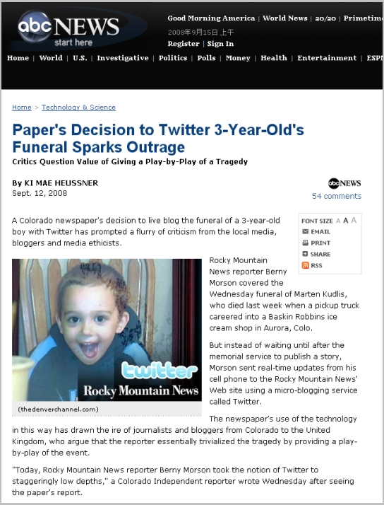 這周末,文字的力量發生了。在被網路界視為「荒涼地區」的美國中部,這周末成為討論焦點,因為丹佛市的「洛磯山脈新聞」有位記者叫Berny Morson,在周末參加了一位三歲男童的喪禮。這位三歲男童名叫Marten Kudlis,在「31冰淇淋」店內被一輛失控衝入的卡車當場撞死,引起當地居民的哀傷,這位記者參加了這場哀悽的喪禮,原本只要在喪禮後隔天寫一篇報導即可,但他卻選擇同時也利用「新媒體」,在當場使用Twitter「報導」這場喪禮的狀況。我們看過許多Twitter訊息是在實況轉播「活動」,譬如「主持人上台了」、「抽獎開始了」;也有實況轉播自己的旅行,譬如「抵達餐廳了」、「到加油站開始加油」,但這位記者這天寫的卻是「人們開始觀看遺體」、「棺木下降」,這下不得了了了,引起衝天爭議!