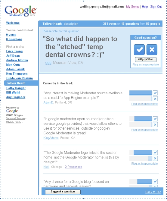 Google的工程師,顯然看到了這個需求。這位Taliver Heath善用他20%的自由做點子時間,發起了這個產品,將它開發完成。開發期間的codename就叫做「多莉」(Dory),也就是海底總動員(Finding Nemo)動畫電影中的那隻老愛問問題的可愛的藍色的魚。當然,Google Moderator這隻「多莉」不是要讓你問更多問題,而是要處理這種「問題過多」的麻煩。