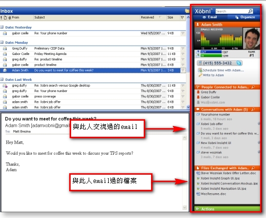 且xobni所開發的function, 以contact來列出往來之間的email, gtalk, 又email 附件的管理, Gmail 早已都在web mail 介面上提供。
