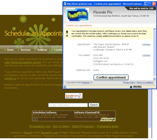 Genbook採用「分散式」,他跑去告訴商家們,你們有自己的網站,沒關係,我不打擾你,我呢,只提供你一個「約時間系統」,裝在你的網站上,譬如這家FlowSkiPix是專門在Lake Tahoe幫出遊活動跟著拍照著攝影師,你可以直接在上面約時間。按下「Make Appointment」鍵,不會離開原網站,只見Genbook幫你跳出一個新視窗,列出所有的選項與價錢,「家族照片」500美元、「簡單照片」50美元…接下來要選照相師,選完後就是最重要的──排時間,這部份,也是一般網站覺得最麻煩也最沒辦法做的。最後,Genbook然後再要求你填入住址、email等等,最後按下「確認鍵」。