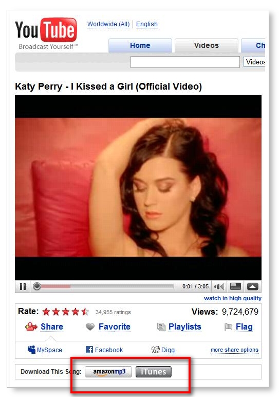 昨天傳出,YouTube開始推出一個新的獲利模式試試看(這篇NewTeeVee的也寫得不錯),這是一個我們叫做「Click to Buy」的按鈕,按下去,就直接跳到某購物網站的購物車線上購買!譬如,看完「Where the Hell is Matt?」的瘋狂音樂與舞蹈,下方擺著一個「Amazon MP3」的超連結,點進去就直接買矣。這部「Katy Perry – I Kissed A Girl」除了Amazon MP3還可以到iTunes,馬上付錢下載這首曲子,然後,這「Click to Buy」不止可以買音樂或影片而已好嗎!他們也和EA的Spore合作,在Spore的影片下方出現「Click to Buy」,跑去買Spore相關產品。以上超連結在目前亞洲版的YouTube都還看不到,只有北美的YouTube有,但站方已經表示,這玩意背後的計畫還很大,可能還將它繼續擴展到更多的地區、與當地的商家作配合。