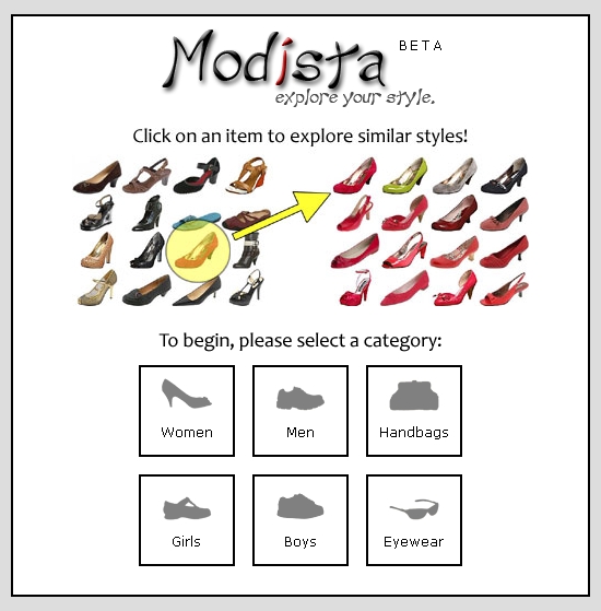 來看看就知道,MODISTA的特色不在它賣的鞋,而是它賣鞋背後的「陳列架」,它有一個直覺式的「商品瀏覽」系統,創立MODISTA的是兩個柏克萊加大電機資訊學系的研究生Arlo Faria與AJ Shankar,用上了兩個技術,一個是判斷照片相似度的技術,另一個是機器學習(machine learning)的演算法,靠這兩招,可以聰明的整理出旗下所有的商品的各種細節,然後讓消費者可以一進MODISTA,它直接先給你48雙鞋,然後,按下去,它又給你另外48雙和你剛剛點擊的類似的鞋,再點下去,它再給48雙其它「更類似」的鞋。