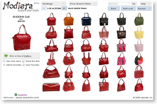 有趣的是,想想,MODISTA的難度並沒這麼高,雖然我們沒有「比圖」的引擎,我們依然可以用「作弊」的方式,如果,每個商品旁邊都可以下了十個tag左右,用這些標籤來分類,就可以營造出類似MODISTA的效果。想想,現在最紅的購物網站是什麼類型的?利用tags,把它做成像MODISTA,我想,就算只是挖個牆角,或許也會是一個一個月上千萬台幣的「大牆角」!