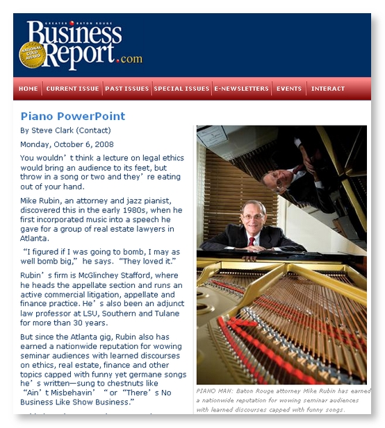 還好,麥可本身,竟也是一位爵士鋼琴師,早在1980年初他便開始將他的音樂與法律長才相結合,開始研究「在無聊演講中加入音樂」的大秘技。當時還沒有電腦,他用講的,另外播放錄音帶,結果他發現,效果非常的之好!然後他又想,「如果要我打破規矩,那就乾脆打破得徹底一點。」從此以後,在演講中加入音樂,就變成Mike Rubin演講的專有標記了。
