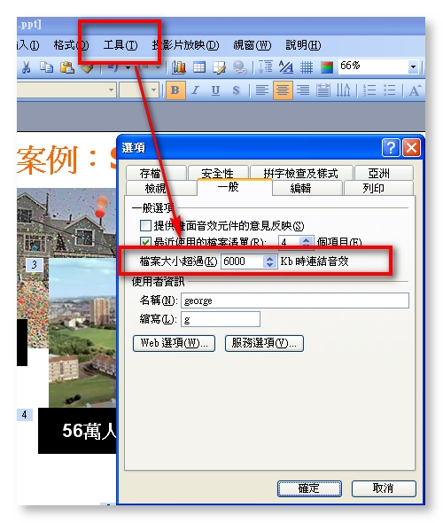 接下來,回到PowerPoint的「工具」、「選項」、「一般」下面,「檔案大小超過xxx kb時連結音效」,把那個數字弄大一點,譬如6000 kb,也就是6MB左右,這樣的話,所有在6MB以下的MP3音樂檔案都可以被「包」在這個PowerPoint檔案中,隨時帶著走!