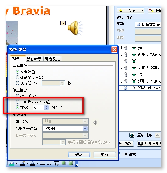 二、橫跨好幾張投影片繼續播放:但自動播放還不夠,輕輕按一下滑鼠可能就沒了,你可能想至少播完目前這投影片的所有動畫,或是你可能想繼續播到其他的投影片。或許,你可能在作自我介紹,中間一共有五張投影片,希望從第10張投影片開始播放音樂,放到第15張投影片之後結束?簡單,直接到動畫配置,點選那個聲音項目,選「效果選項」,在「效果」下面,「停止播放區」,點選「在XX投影片」。這個XX記得寫「6」,也就是說,在目前的第10張投影片之後加「6」,也就是第16張投影片放映之前就結束音樂。