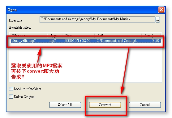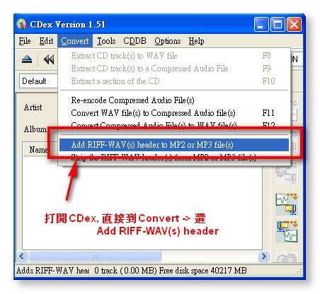 先下載一個可以轉換檔案的軟體叫CDex(請到這裡下載),它會會這個MP3檔案直接加一個RIFF WAV檔頭,好消息是,檔案大小不會改變,接下來啟動這個CDex,按照下列指示: