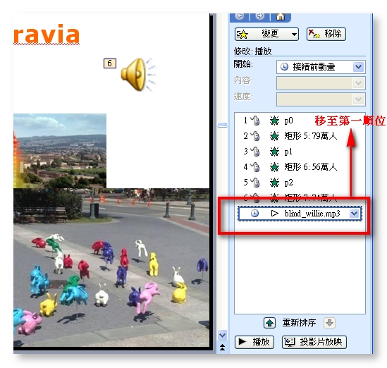 一、自動播放這個音樂:如果你嵌了一個聲音,在該投影片上面也看到一個黃色的小喇叭了,卻不會自動播放,通常只是因為,你這個投影片還有其他自訂動畫的緣故,這時候,只要到「自訂動畫」區,找到那個音樂的項目,將它「拉」到第一個,就會自動播放了。