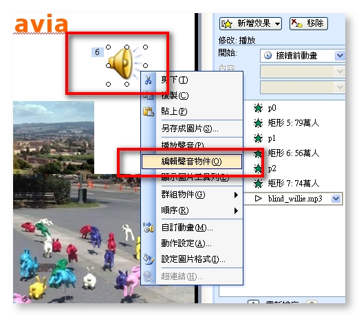 三、循環播放這個音樂:如果這音樂很短,播完後還想再繼續播,只要在那個黃色的小喇叭上面按右滑鼠鍵,選擇「編輯聲音物件」,然後點一下「循環播放,直到停止」。