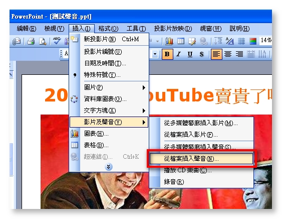 看了Mike Rubin的成功,我來研究了一下,怎麼在PowerPoint裡播放音樂的大法。很多人應該已經摸索過、知道PowerPoint可以嵌一個WAV或MP3,看過那個「黃色的小喇叭」:
