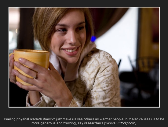 上周五在《Science》期刊登出耶魯大學心理學家的研究,終於第一次證實「暖」的東西真的會「暖進心裡」!他們找來了41個大學生作實驗,先遞給他們一人一杯飲料,有的是熱咖啡,有的是冰咖啡,然後讓他們不知不覺的握著那杯咖啡走進門,開始填一份問卷。這份問卷形容一個不存在的「甲君」,將這位「甲君」形容了老半天以後,再請學生從一分到七分評價一下他們對於這個「甲君」各方面的觀感如何,其中一項包括「甲君是不是一個溫暖的人?」,最後計算下來發現,握過熱咖啡的學生,都認為「甲君是比較溫暖的」,但握過冰咖啡的學生,卻覺得「甲君比較沒有這麼溫暖」,其他關於甲君的想法則不受咖啡溫度影響。從數字來看,握過熱咖啡的學生,覺得甲君溫暖的程度,比握著冰咖啡的學生多出足足11%。