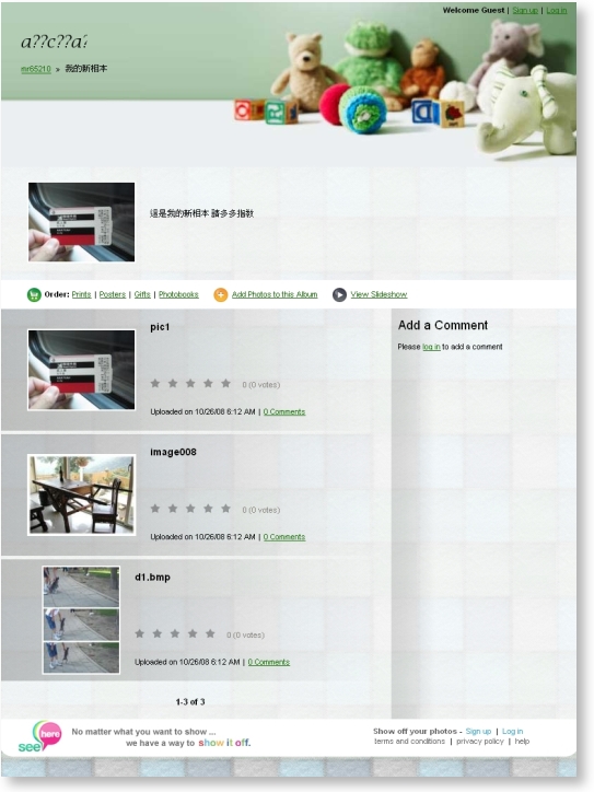 他們的負責人很「識相」的了解這一點,並點出了他們打算用來打破競爭的策略,「我們知道人們現在一人都使用好幾個相簿網站,所以SeeHere.com會是一個非常非常容易瀏覽與使用的新相簿網站。」FujiFilm的這個SeeHere.com將許多力氣放在這裡,所有新的使用者,他們第一次使用SeeHere.com就是會看到一個「精靈化介面」(wizard),一步一步的帶著你走,從頭到尾只有四個步驟:選圖、上載、設網址、選版型。我自己沒有比較過目前所有各式各樣的相簿系統,所以無法確定SeeHere.com已是最簡單的介面,但從一些Forum已經傳出來的評語,幾乎都對它的評價非常正面。