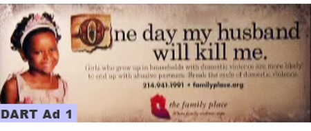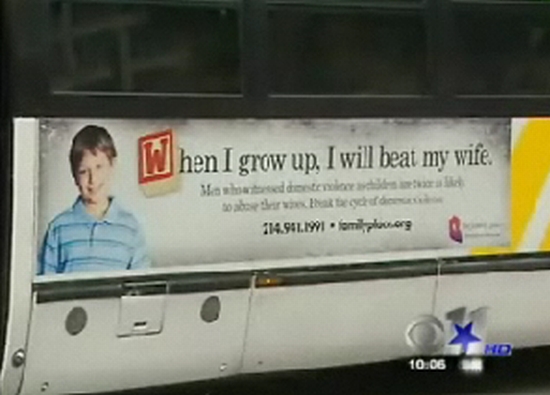 前幾天看到一則發生在美國達拉斯城(Dallas City) 爭議廣告所引發的地方新聞,已有30年歷史的家暴防治組織The Family Place,花了2萬5千元美金(台幣70萬)的廣告預算,買下了45輛公車的外牆廣告、300輛公車的內部廣告,從十月一日到十一月三十一日,強力播放一則很有「特色」的廣告: