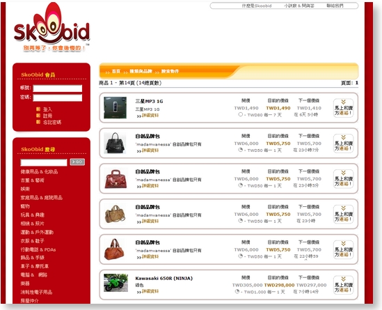 目前SkoObid才剛開站,若用空白搜尋,似乎只有14樣商品,目前有八項正在「進行」中,譬如我會看到這個自創品牌女用包包,原價是6000元台幣,以後預計每天下跌50元,今天的價錢為5750元,又譬如這個Kawasaki 650R重型二手機車原價為30萬5千元,預計一天下跌1000元,目前價格已跌破30而來到29萬8千元,還有這個三星MP3 1G,原價為1490元,目前由於還在第一天,因此還是原價,明天起一天會下跌80元,請慢慢等!